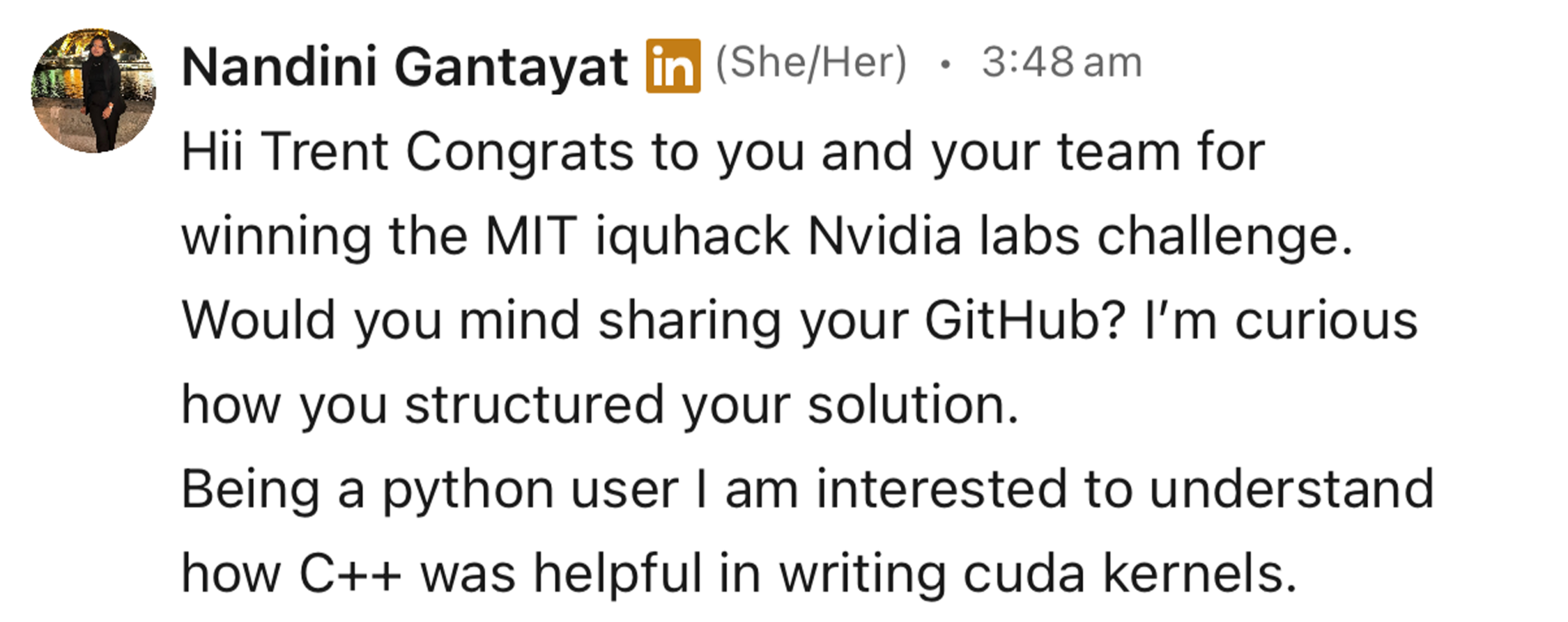 This article focuses on the quantum aspect of this project (because I’m the one writing it, and I don’t know if you’ve been able to tell but I’m kind of a quantum guy) but all of the classical work here went just as deep into computer science as the quantum work did in its respective field. It’s almost an insult that we only dedicated a single slide to it in our presentation. I think Nandini Gantayat on Trent’s LinkedIn said it best: “Being a python user I’m interested to understand how C++ was helpful in writing cuda kernels.” You and me both Nandini, you and me both.